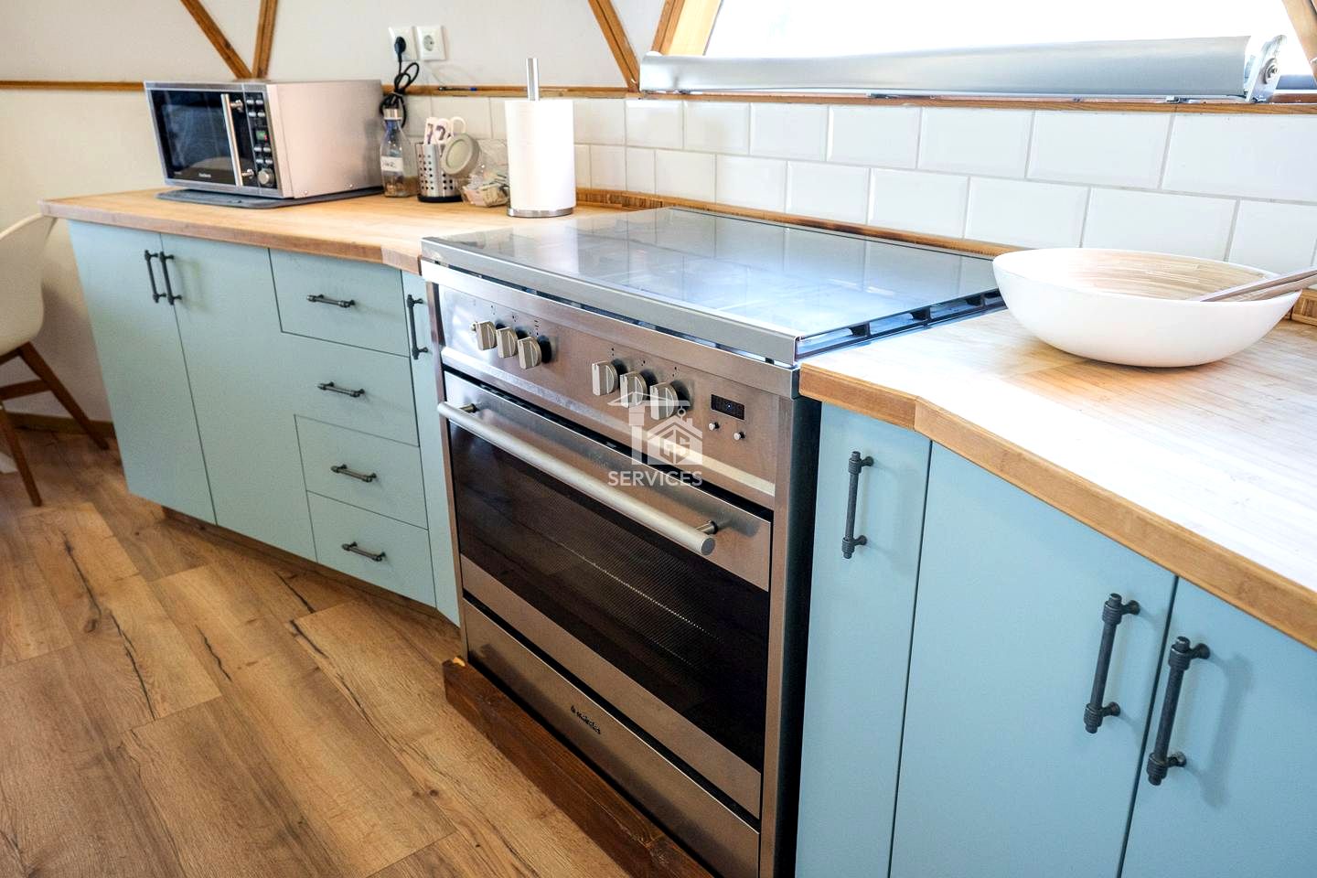 Le dôme principal, réparti sur deux niveaux, dispose au rez-de-chaussée d’une cuisine entièrement équipée, d’une chambre avec salle de bain attenante et d’un coin salon accueillant. À l’étage, une chambre ouverte avec salle de bain attenante offre espace, luminosité naturelle et une connexion visuelle unique avec la structure en bois.